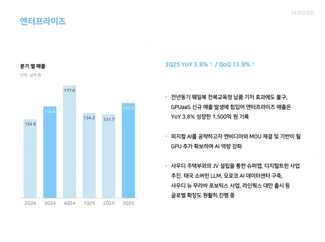 네이버 엔터프라이즈 부문이 국내외 인공지능(AI) 인프라 사업을 확장하고 서비스형 그래픽처리장치(GPUaaS) 신규 매출 확보하며 올해 3분기 실적을 견인했다.