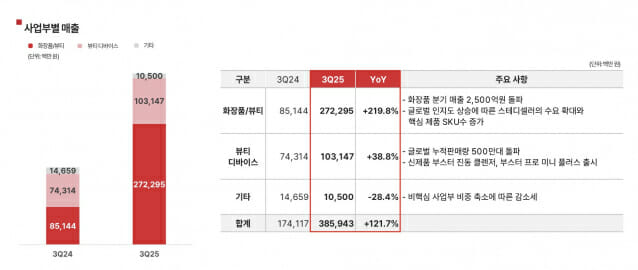 신재하 에이피알 부사장은 “3분기 연결 매출액은 전년 대비 122% 증가했다”며 “영업이익은 253% 성장해 매출과 함께 사상 최대 실적을 달성했다”고 밝혔다. 영업이익률은 25%로, 지난 분기에 이어 높은 수익성을 유지했다.