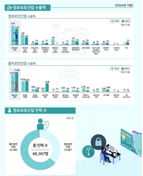 2024년 기준 국내 정보보호 산업 전체 수출액은 약 1조 8722억 원으로 전년대비 11.4% 늘었다. 이중 정보보안 수출은 1242억 원으로 전년 대비 15.9% 증가했다. 물리보안 수출은 1조 7480억 원으로 14.1% 늘었다.
