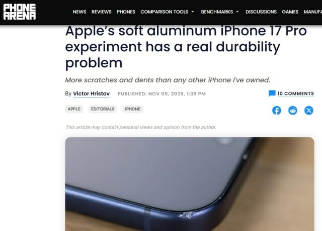 보도에 따르면, 과거 티타늄과 스테인리스 스틸 프레임을 사용했던 아이폰15 프로와 아이폰16 프로의 경우 약 한 달 사용 후 화면에 미세한 긁힘 외에는 측면에 큰 흠집이 없었던 것에 반해, 아이폰17 프로의 경우 기기 측면에 긁힘과 움푹 패인 자국이 다수 발견된 것으로 나타났다.
