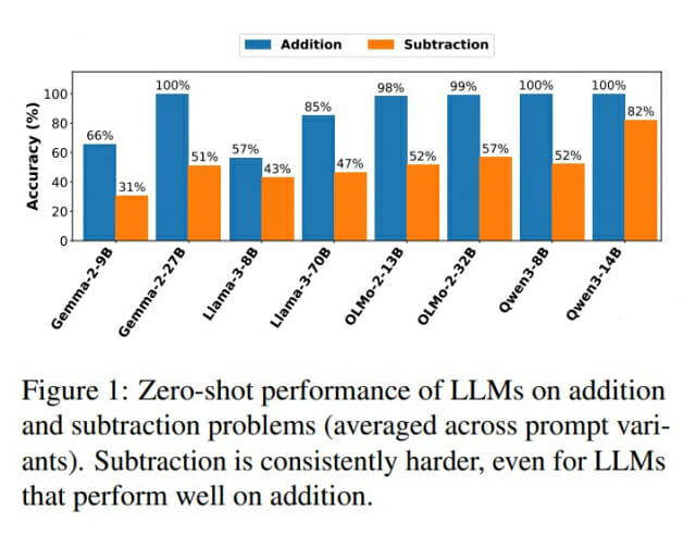 연구팀은 구글의 Gemma-2, 중국의 Qwen2, 메타의 Llama-3, AI2의 OLMo-2 등 4개 모델 패밀리의 8가지 AI를 대상으로 덧셈과 뺄셈 실력을 비교했다. 각 AI가 한 번에 인식할 수 있는 숫자 범위 안에서 균형 잡힌 문제를 만들어 테스트했고, 같은 질문을 5가지 방식으로 바꿔가며 물어봤다.
