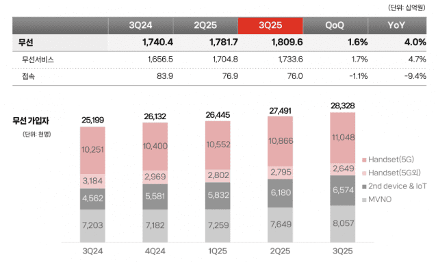 무선 사업 매출은 4.0% 증가한 1조8천96억원을 기록했다. 무선 서비스 매출은 1조7천336억원으로 연간 4.7% 늘었다. 3분기 말 기준 5G 가입자는 전체 핸드셋 가입자의 80.7%를 차지했다. 5G 핸드셋 가입자는 1천104만8천이다.