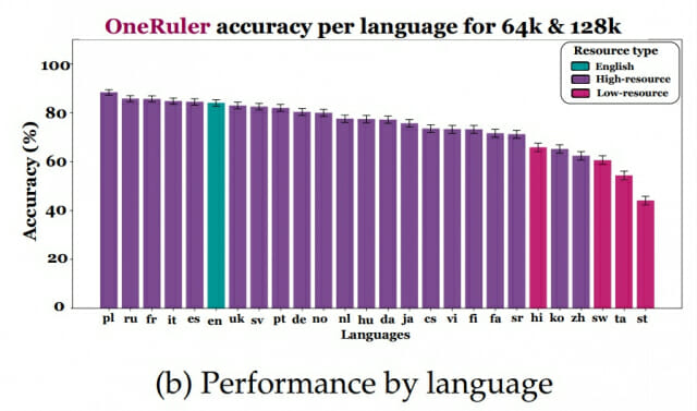 연구진이 6만 4천~12만 8천 토큰 길이의 긴 맥락 과제를 평가한 결과, 한국어는 26개 언어 중 22위를 기록했다. 원룰러 벤치마크의 니들 인 헤이스택(NIAH) 과제 평가에서 한국어는 중국어, 타밀어, 스와힐리어, 세소토어와 함께 하위권에 속했다. 흥미롭게도 폴란드어가 평균 정확도 88%로 1위를 차지했고, 영어는 83.9%로 6위에 머물렀다. 중국어는 62.1%로 하위 4위를 기록했다. 대부분의 AI 모델이 영어와 중국어 데이터로 주로 학습된다는 점을 고려하면 이는 매우 의외의 결과다. 상위 10개 언어는 대부분 슬라브어, 로망스어, 게르만어 계통으로 위키피디아 문서 수가 많고 라틴 문자를 사용하는 언어들이었다.
