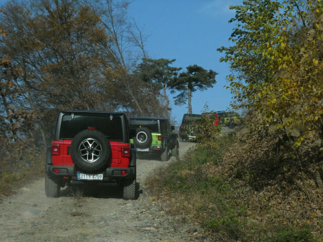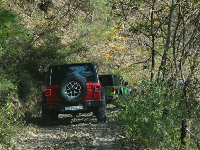 산길은 비포장도로다. 산에서 흘러 내려온 낙석과 바닥에 박혀있는 돌, 움푹 꺼진 땅은 주행을 방해한다. 하지만 랭글러의 전자식 스웨이 바 디스커넥트 기능을 사용하면 험난한 지형의 접지력을 높여 안정성을 높인다.