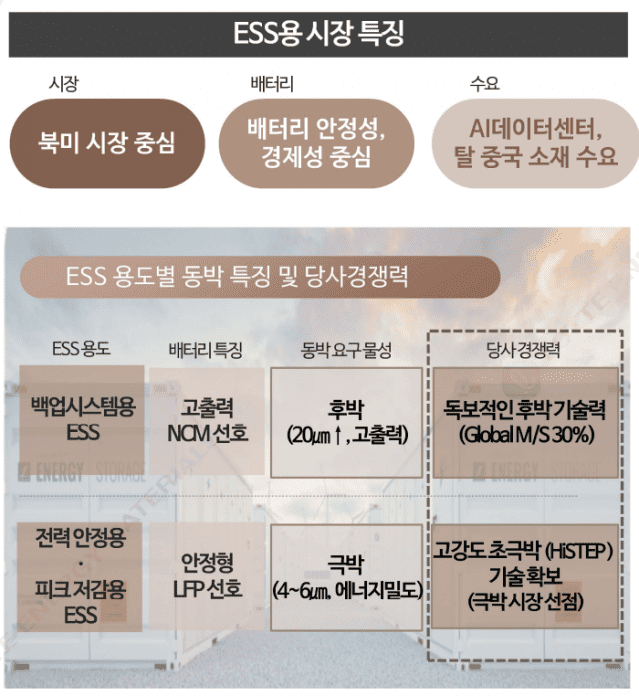 롯데에너지머티리얼즈는 내년 하반기 ESS 라인 가동 예정인 북미 OEM 대상으로 ESS용 제품 승인을 진행 중이고, 라인 가동 시점부터 본격 매출이 발생할 것이라고 밝혔다.