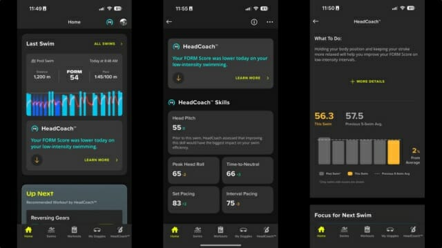 헤드코치 2.0은 ▲스트로크당 거리(DPS) ▲스트로크 속도 ▲페이스 ▲심박수와 같은 지표는 물론 개인 폼 스코어와 기존 앱 데이터까지 분석한다. 기술 향상이나 경기 준비 등 사용자가 설정한 목표에 맞춰 인사이트를 제공할 수 있으며, 목표 달성을 위해 다음 세션에서 무엇을 달성해야 할지 집중적으로 분석해 알려준다.