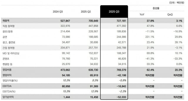하이브는 올해 3분기 연결 기준 매출은 7천272억원으로, 전년 동기비 37.8% 늘어났다고 10일 밝혔다. 지금까지 분기 최고 매출로 기록됐던 2024년 4분기 실적(7천264억원)을 초과했다. 반면 같은 기간 영업이익은 투자와 일회성 비용 지출로 422억원 손실을 봤다.