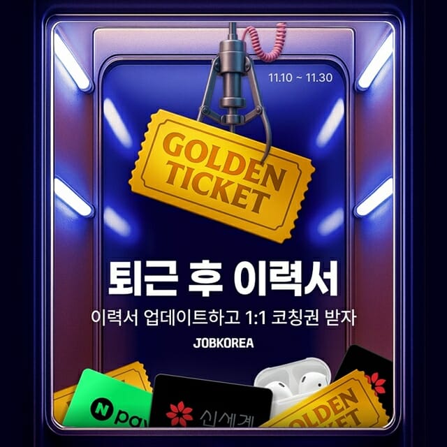 잡코리아는 신청자 중 60명을 선정해 오프라인 강연, 네트워킹 행사에 참여할 수 있는 ‘골든 코칭권’을 제공한다. 행사는 ▲토스뱅크 ▲롯데카드 ▲아모레퍼시픽 등 현직자 선배의 취업 특강이 열리고 이후 참가자별 이력서 첨삭 및 1:1 코칭 등 다양한 프로그램이 진행된다. 잡코리아 본사 라운지에서 내달 16일 마케팅 직군을 시작으로, 17일 PM·PO, 18일 개발 순으로 3일간 열릴 예정이다.