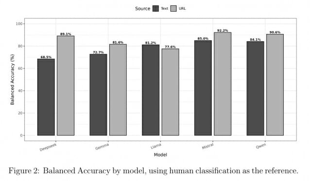 딥시크 모델은 가장 큰 차이를 보였는데, 기사 전문을 읽었을 때는 68.5%에 그쳤지만 URL만 봤을 때는 89.1%까지 올라갔다. 이는 이 모델이 웹사이트 주소 정보에 크게 의존한다는 것을 보여준다. 젬마는 본문으로 72.7%, URL로 81.6%를, 라마는 본문으로 81.2%, URL로 77.6%의 정확도를 기록했다.