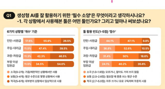 흥미롭게도 직급별 'AI 활용 적극성'에서는 예상과 다른 결과가 나타났다. '부장 이상 임원급'의 활용 적극성(54.0%)이 '과장-차장급'(46.5%)이나 '사원-대리급'(39.5%)보다 오히려 더 높은 수치를 보였다. 이는 AI가 실무자의 업무 보조 역할뿐만 아니라, 관리자의 전략적 의사결정 도구로도 활용되고 있음을 시사한다.