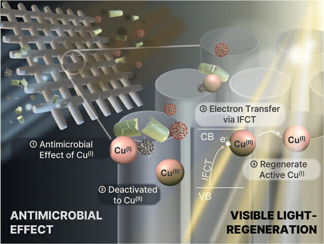 연구팀은 구리와 이산화티타늄 사이에서 전자가 이동해 구리의 항균 활성 상태를 스스로 회복시키는 원리를 이용했다. 이를 이용해 빛이 닿을 때마다 항균 기능이 재생되는 자가회복형 시스템을 구축했다.