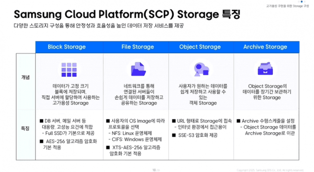 삼성SDS는 이러한 수요에 대응하기 위해 SCP 기반 블록·파일·오브젝트·아카이브 스토리지로 구성된 포트폴리오를 제시했다. 블록 스토리지는 고성능·고가용성이 필요한 데이터베이스·메일 서버 등에 적합하고 파일 스토리지는 여러 서버가 네트워크를 통해 데이터를 손쉽게 공유하는 구조다.