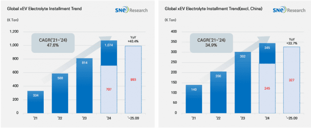 14일 SNE리서치에 따르면 올해 1~9월 전 세계적으로 등록된 전기차(EV, PHEV, HEV)에 사용된 전해액 총 적재량은 약 99만3천톤으로, 전년 대비 40.4% 성장한 것으로 나타났다. 같은 기간 중국을 제외한 시장에서도 32만7천톤을 기록하며 33.7% 성장해, 안정적인 수요 확대 흐름을 이어가고 있다.