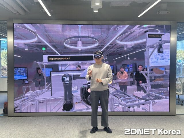 백 컨설턴트는 로봇이 멈춘 상황을 인지하고 비전 프로를 착용한 채 실제 현장처럼 로봇에 다가갔다. 기기 화면에는 고장 지점과 로봇 팔의 향후 움직임이 '예상 경로'로 표시됐다.