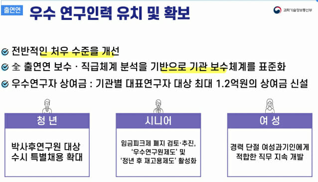 구 차관은 기본연구사업 재편과 전략연구사업 신설 등으로 임무중심 사업구조를 체계화하겠다면서 "기관별 대표연구자 대상 최대 1.2억원의 상여금을 주는 등 우수 연구인력 유치 및 확보에도 힘을 쏟겠다"고 말했다.