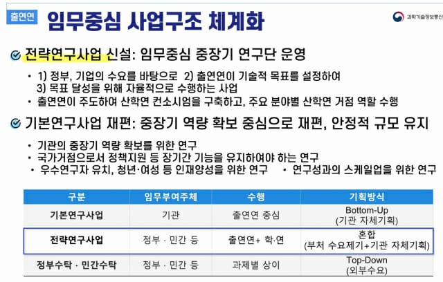 와중에, 구혁채 과학기술정보통신부 제1차관은 13일 전임출연연구기관장협의회가 개최한 '2025년 제3회(통산 55회) 과학기술 정책포럼'에서 주제발표자로 나서 "향후 5년간 종료되는 정부수탁과제를 기관출연금으로 전환, 이 비중이 2024년 기준 35%인데 2030년까지 80%로 높이겠다"고 밝혔다. 이어 "소요 인건비 전체를 출연금으로 충당하겠다"고 덧붙였다. 현재(2024년 기준)는 이 비중이 55%에 달한다.