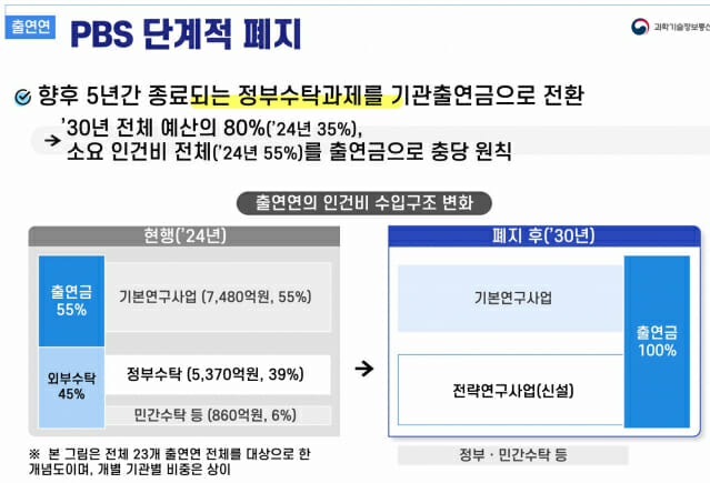 정부가 정부출연연구기관(출연연)의 PBS(Project Based system) 제도를 오는 2030년까지 단계적으로 폐지하는 것을 국정과제로 추진하고 있다. 1996년 도입된 PBS는 경쟁을 통해 연구성과를 높인다는 취지로 제도가 시행됐지만 수주하기 쉬운 과제로 연구가 몰리는 등 부작용이 커지면서 폐지 요구가 높았다. 이에, 정부는 출연연의 과제 수주 부담을 줄이고 연구원들이 연구에만 몰두할 수 있는 환경을 만들기 위해 PBS 대신 새로운 제도 도입을 모색하고 있다.