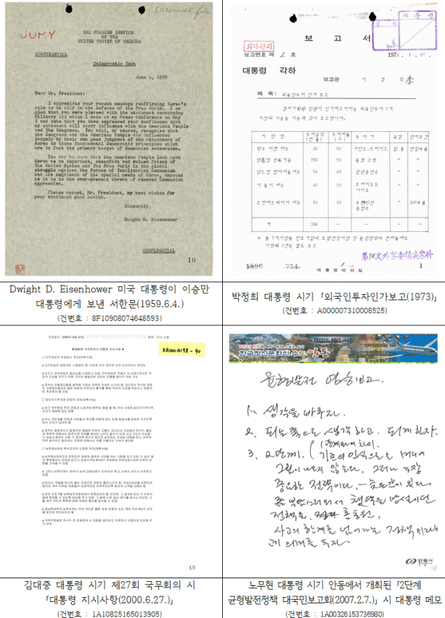 이번에 공개되는 주요 기록물은 대통령 외교서한(편지), 각 대통령별 주요 정책을 담고 있는 보고자료, 회의자료 등이다.