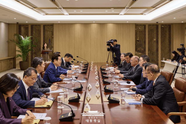 이재용 삼성전자 회장, 최태원 SK 회장, 정의선 현대차그룹 회장, 구광모 LG그룹 회장, 여승주 한화 부회장, 정기선 HD현대 회장, 서정진 셀트리온 회장 등 그룹 총수는 16일 이재명 대통령 주재 ‘한·미 관세 협상 후속 민관 합동회의’에서 이 같은 국내 투자 및 일자리 창출 계획을 발표했다.