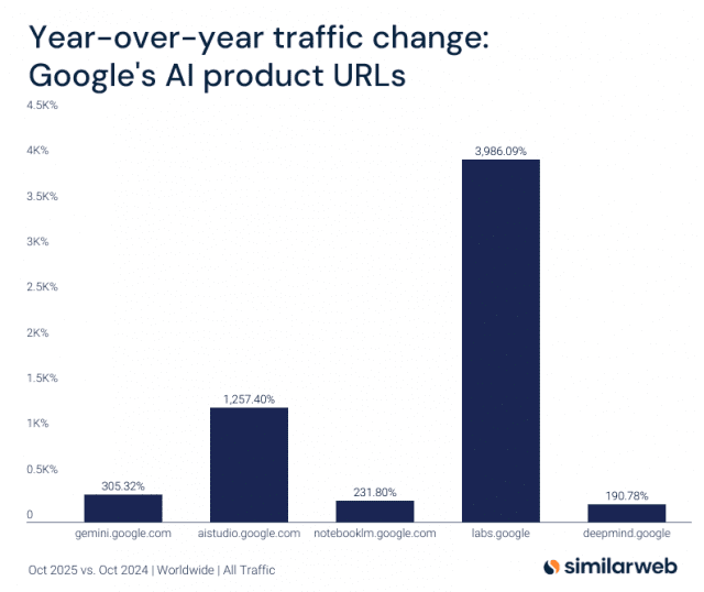 구글의 AI 제품 관련 사이트 트래픽이 2025년 10월 기준으로 전년 대비 폭발적인 증가를 기록했다. 시밀러웹(SimilarWeb) 분석에 따르면, 구글의 AI 연구 사이트인 labs.google은 무려 3986.09%의 증가율을 보이며 가장 높은 성장세를 나타냈다.