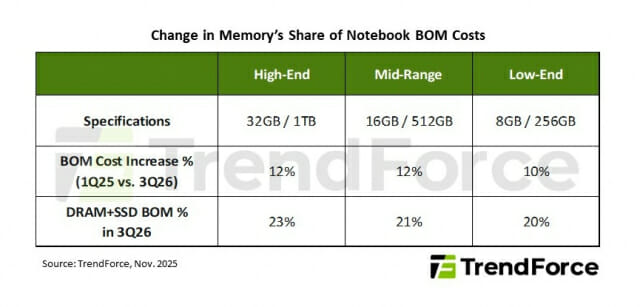 노트북 산업 역시 비슷한 상황에 처할 것으로 전망된다. 노트북의 제조원가 중 메모리가 차지하는 비중은 가격 인상 전에는 10~18% 수준이었으나, 내년에는 20%를 넘어설 것으로 관측된다.