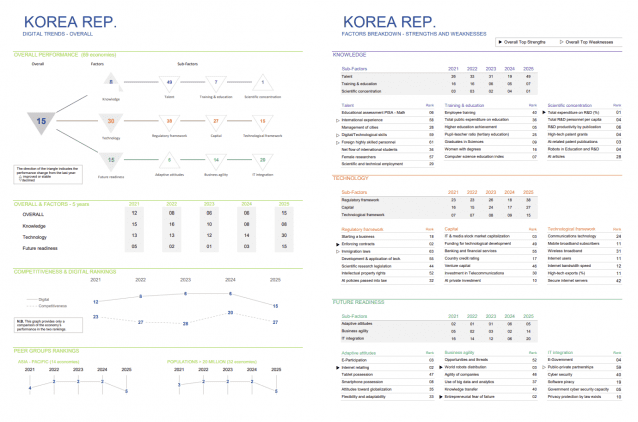 17일 스위스 국제경영개발원(IMD)이 발표한 '세계 디지털 경쟁력 순위(WDCR) 2025' 보고서에 따르면 한국은 전체 69개국 중 15위를 기록해 전년 대비 9계단이나 떨어졌다.
