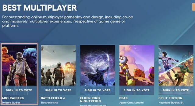 같은 부문 후보작으로는 슈팅 액션 게임 ‘배틀필드6’, 서바이벌 액션 게임 ‘엘든링 밤의 통치자’, 협동 게임 ‘피크’, 협동 액션 게임 ‘스플릿 픽션’이 있다.