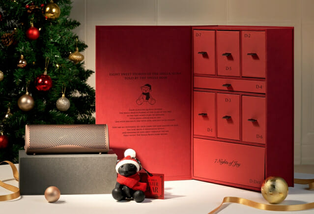 이번 어드벤트 캘린더는 총 8개의 선물 박스로 구성된다. 선물은 최소 57만원에서 최대 130만원 상당으로 ‘신라베어 키링 윈터 에디션’을 비롯해 서울신라호텔과 협력해 청음회를 진행해온 영국 하이파이 오디오 브랜드 KEF의 ‘하이파이 포터블 스피커(휴대용 스피커)’도 포함됐다.