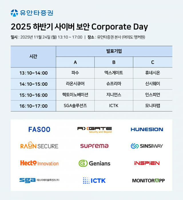 공동설명회에는 라온시큐어, 모니터랩, 슈프리마, 신시웨이, 엑스게이트, 인스피언, 지니언스, 파수, 헥토이노베이션, 휴네시온, ICTK, SGA솔루션즈 등 12개사가 참여한다. 역대 최다 규모다. 유안타증권이 후원한다. 행사는 오는 24일(월) 여의도 앵커원 유안타증권 본사에서 진행한다.