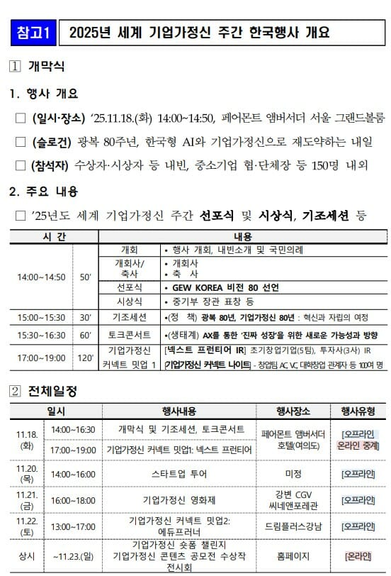 중소벤처기업부(장관 한성숙)는 18일부터 23일까지 6일간 서울 페어몬트 앰버서더 서울 등에서 ‘2025 세계 기업가정신 주간 한국행사(GEW KOREA 2025)’를 개최한다.