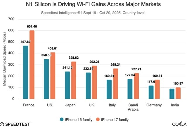우클라는 N1 칩을 “상당한 업그레이드”라고 평가하며, 미국·프랑스·이탈리아·영국·인도·일본 등 분석 대상 국가 모두에서 속도 향상이 확인됐다고 설명했다. 또, N1 칩이 까다로운 와이파이 환경에서도 더 일관된 성능을 제공하는 경우가 많다고 덧붙였다.