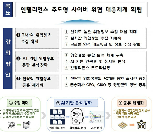 19일 금보원에 따르면, 위협 인텔리전스 주도형 대응체계 확립을 위해 ▲신뢰도 높은 위협정보 수집 채널 확대 ▲위협정보 통합 분석 체계 구축 및 AI 기반 연관성 및 유사도 분석 ▲전략적 위협정보 공유 체계화 등 수집-분석-공유 전 과정의 대응을 강화한다.