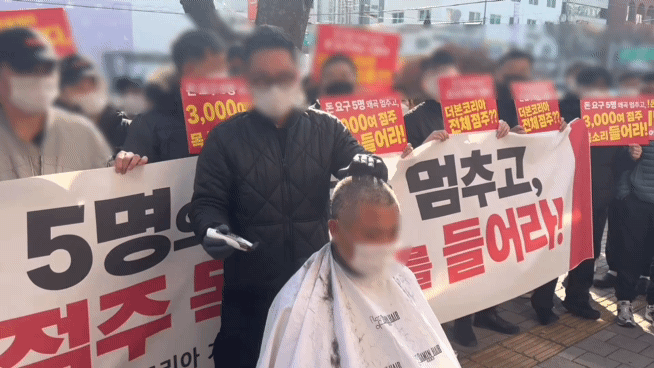 이날 홍콩반점 파주문산점을 운영한다는 점주 모기범 씨는 삭발 시위를 감행하며 항의 의지를 드러냈다. 그는 외식업에 20년 넘게 종사했고 홍콩반점을 4년째 운영 중이라며 “전가협이 너무 한쪽 편에 서서 사실을 왜곡하고 다른 점주들을 공격해서 선량한 점주들까지 매출이 떨어지는 피해를 보고 있다”고 말했다.