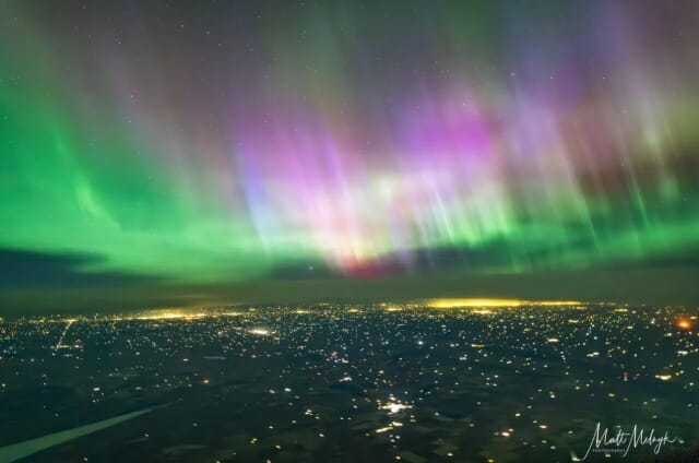 지난 12일 항공기 조종사이자 사진작가인 매트 멜닉은 영국 런던에서 캐나다 캘거리로 향하는 보잉787 드림라이너 기내에서 약 11㎞ 상공을 순항하던 중 장관을 이룬 오로라 쇼를 촬영했다.