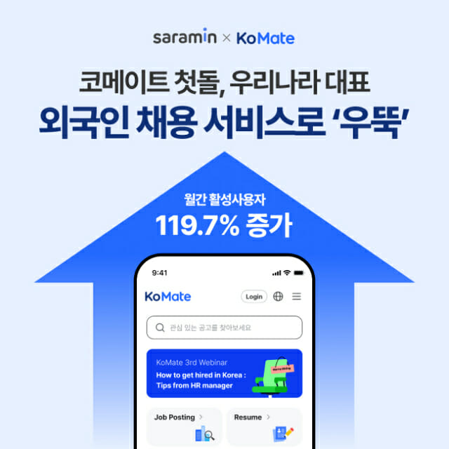 사람인 코메이트 관계자는 “코메이트는 지난 1년간 차별화된 서비스 경험을 통해 사용자들의 성원을 얻으며 단시간에 우리나라 대표 외국인 채용 서비스로 우뚝 섰다”며 “앞으로도 사용성을 최우선으로 한 서비스 고도화와 확장을 통해 한국 취업과 정착을 원하는 외국인과 외국인 인재를 찾는 기업이 만나는 K-커리어 허브로서의 위상을 굳건히 할 것”이라고 말했다.