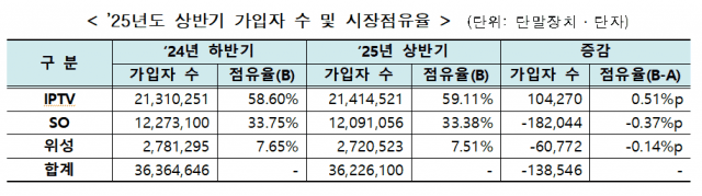 24일 방송미디어통신위원회가 발표한 2025년도 상반기 유료방송 가입자 수에 따르면, 올 상반기 유료방송 가입자 수는 지난해 하반기 대비 13만8천546이 감소한 3천622만6천100을 기록했다.