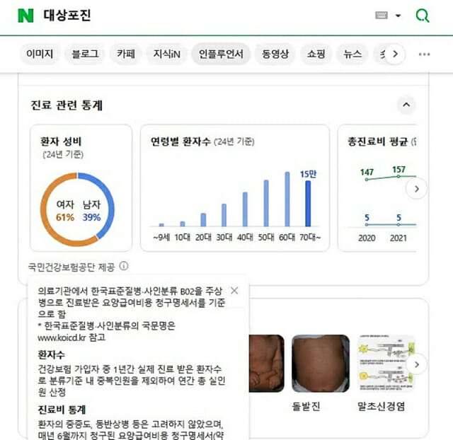네이버 검색창에 질병명(대상포진, 고혈압 등)을 입력하면 해당 질병에 대한 임상 정보와 함께 전 국민 의료이용 정보를 토대로 산출된 ▲환자수(연령대별 진료실인원, 환자 성비) ▲진료비(1인당 연간 외래‧입원별 총진료비 평균 및 범위) 통계 정보를 손쉽게 조회할 수 있다.
