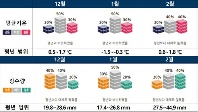 기온은 12월 0.5~1.7도, 내년 1월 –1.5~-0.3도로 평년과 비슷하고, 2월은 0.6~1.8도로 평년 보다 대체로 높을 것으로 예상되는 가운데 월내에서 변동성이 클 것으로 전망된다.