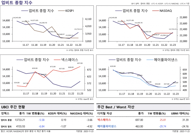 11월 17일부터 23일까지 한 주 동안 업비트 종합지수는 전주 대비 -5.58% 하락했고, 업비트 알트코인 지수는 -6.84%로 더 큰 낙폭을 보였다.