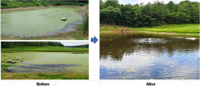 경북 영천CC와 강원 비콘힐스CC 골프장 연못은 물 색이 탁한 녹색에서 투명에 가까운 상태로 개선되고, 악취가 사라졌다는 것이 설 대표의 부연 설명이다.
