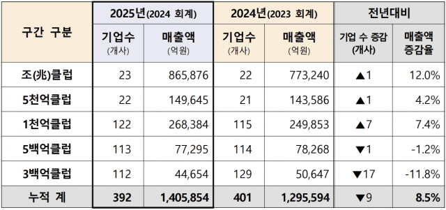 반면 매출 300~500억원 구간의 기업 수는 감소세를 보여 중견 기업의 상향 이동 및 구조조정 영향이 반영된 것으로 분석됐다. '500억클럽'은 113개사로 전년 대비 1개사 감소했다. '300억클럽'은 전년보다 17개사가 줄어든 112개사로 조사됐다.