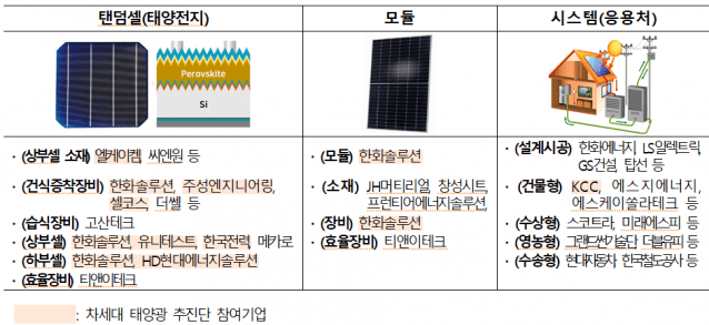 산업계에서는 한화솔루션, HD현대에너지솔루션, KCC, 주성엔지니어링, 엘케이켐, 유니테스트 등이, 대학·연구기관에서는 고려대, 성균관대, 울산과학기술원(UNIST), 에너지기술연구원, 화학연구원, 전력연구원 등이 참여한다. 정부 측에서는 기후부와 산업부 등이 추진단에 함께한다. 기후부는 탠덤셀 상용화를 위한 R&D·실증·인력 양성을 집중 지원하고, 기재부·산업부는 인프라 구축을 뒷받침할 계획이다.