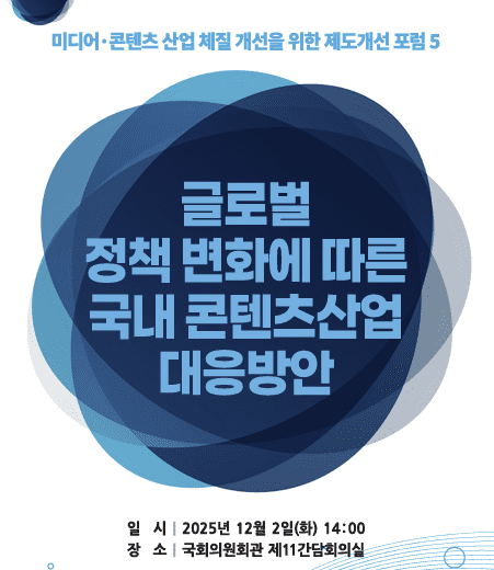 더불어민주당 한민수 의원과 디지털미래연구소는 12월2일 오후 2시 국회의원회관에서 ‘글로벌 정책 변화에 따른 국내 콘텐츠 산업 대응 방안’을 주제로 다섯 번째 미디어콘텐츠 산업 체질 개선을 위한 제도개선 포럼을 개최한다고 밝혔다.