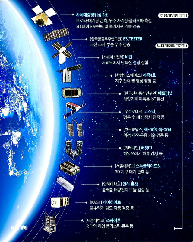 누리호 4호기 탑재 위성은 모두 13기다. 주탑재 위성은 차세대중형위성 3호(CAS500-3)이다. 차중 3호는 무게만 516kg이다. 고도 600km에서 태양 위치를 따르는 태양동기궤도를 돌면서 ▲지구 오로라/대기광 관측 ▲우주 자기장/플라즈마 측정 ▲3D 바이오프린팅 및 줄기세포 기술 검증에 나설 계획이다. 임무 수명은 1년 이상이다.