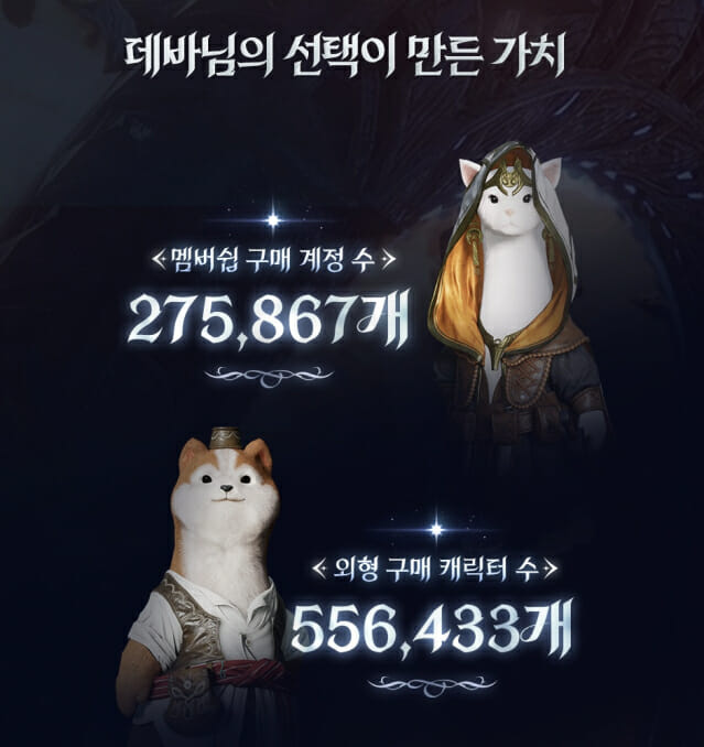 오늘 공개된 인포그래픽을 보면 일주일 누적 ▲생성 캐릭터 수 252만7698개 ▲총 플레이 타임 17억2851만분(약 2천880만시간) ▲멤버십 구매 계정 27만5867개 ▲외형 구매 캐릭터 수 55만6433개 ▲스타일샵 다운로드 38만2714회 등을 기록했다.