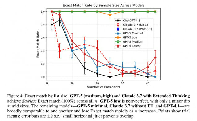 GPT-5도 마찬가지였다. GPT-5에는 ' 추론 노력(reasoning effort)' 설정이 있다. '최소(minimal)', '낮음(low)', '중간(medium)', '높음(high)' 네 단계로 나뉘는데, '중간'이나 '높음'으로 설정하면 모든 문제를 완벽하게 맞혔다. 반면 '최소'나 '낮음'으로 설정하면 이전의 일반 AI처럼 문제가 길어질수록 성적이 급격히 떨어졌다.