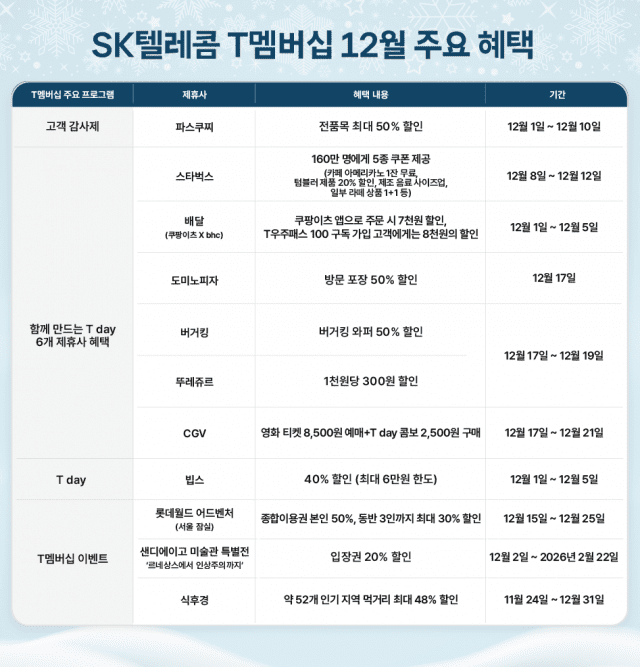SK텔레콤이 고객 감사제를 비롯해 160만명에 스타벅스 쿠폰을 제공하는 T day 등 12월 T멤버십 구성을 공개한다고 27일 밝혔다.