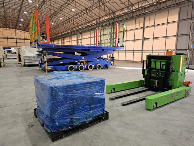 자재·장비 운반을 위한 자동화 솔루션 SMR(스마트모바일로봇)도 자체 개발 제품이다. 기존 수동 운방 방식의 안전사고 위험과 작업자의 근골격계 질환 발생 요인을 줄일 수 있다.