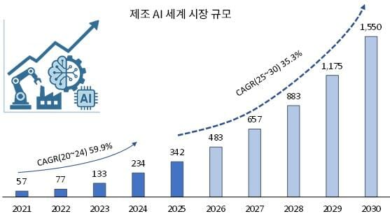 AI 제조 전환은 세계적 패러다임이다. 해외 시장보고서(MarketsandMarkets, 2025.8.)에 따르면 제조 AI 시장은 2025년 342억 달러, 2030년 1,550억 달러로 연평균증가율 35.3%로 급성장할 전망이다.