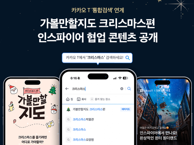 카카오모빌리티가 연말 시즌을 맞아 카카오 T ‘통합검색’을 통해 ‘가볼만할지도 크리스마스편’과 인스파이어 엔터테인먼트 리조트 협업 콘텐츠를 제공한다고 28일 밝혔다.